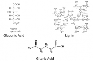 The following figure shows the difference in the molecular structure of the organic acids present in Natural Express (gluconic and glutaric) and some other acids such as lignin. The very small molecular size of the acids found in Natural Express is noted.